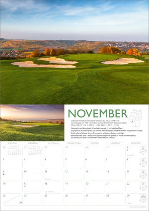 Planen Sie Ihre Golfsaison. Mit Platz für Notizen und Handicap-Statistik. Golf-Termine gehören an die Wand und nicht in die Cloud. Sind doch viel zu wichtig!