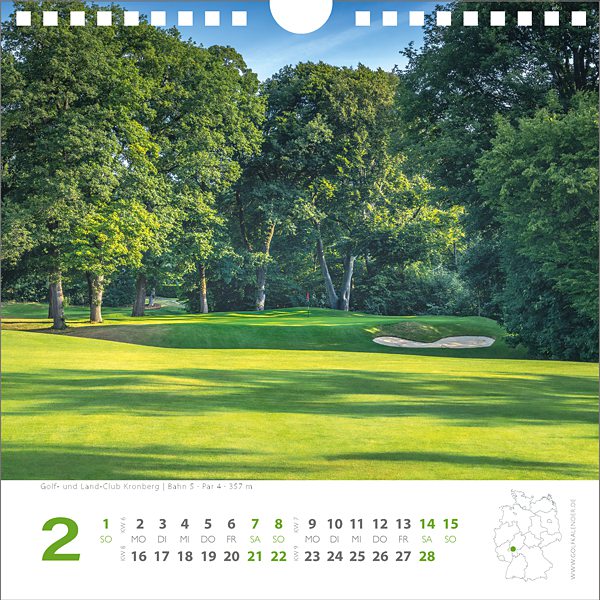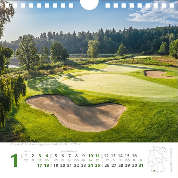 Wie sein großer Bruder zeigt auch der Mini die schönsten Golfplätze Deutschlands in stimmungsvollen Aufnahmen. Das übersichtliche Kalendarium bietet alle wichtigen Informationen: Kalenderwochen, gesetzliche Feiertage und die Termine der wichtigsten internationalen Golfturniere. So behalten Golferinnen und Golfer den Überblick über ihre Golf-Saison.